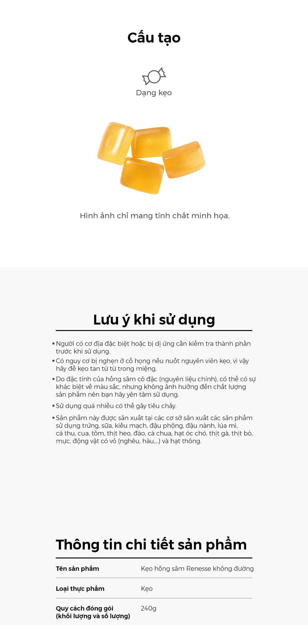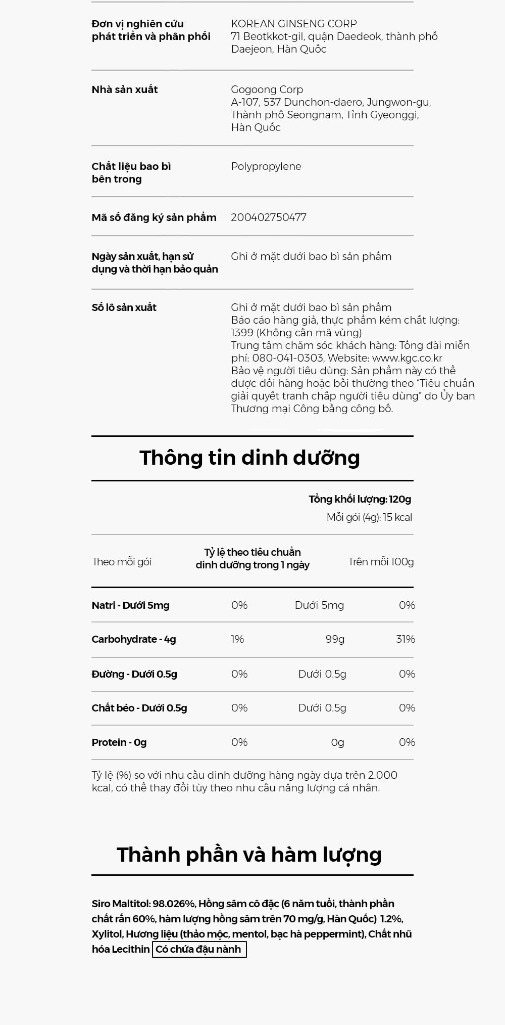 Thành phần và hàm lượng: Xi-rô maltitol 98,026%,Tinh chất hồng sâm 6 năm tuổi (chất rắn 60%, thành phần hồng sâm trên 70 mg/g, sản xuất tại Hàn Quốc) 1,2%, xylitol, hương liệu tự nhiên (hương thảo mộc, hương mentol, hương bạc hà), lecithin ( chứa đậu nành)