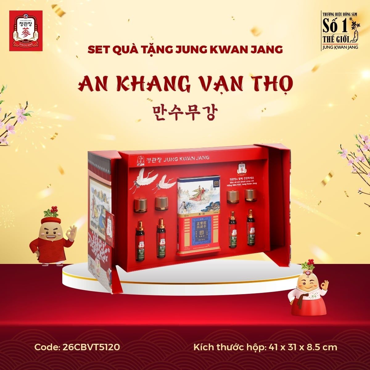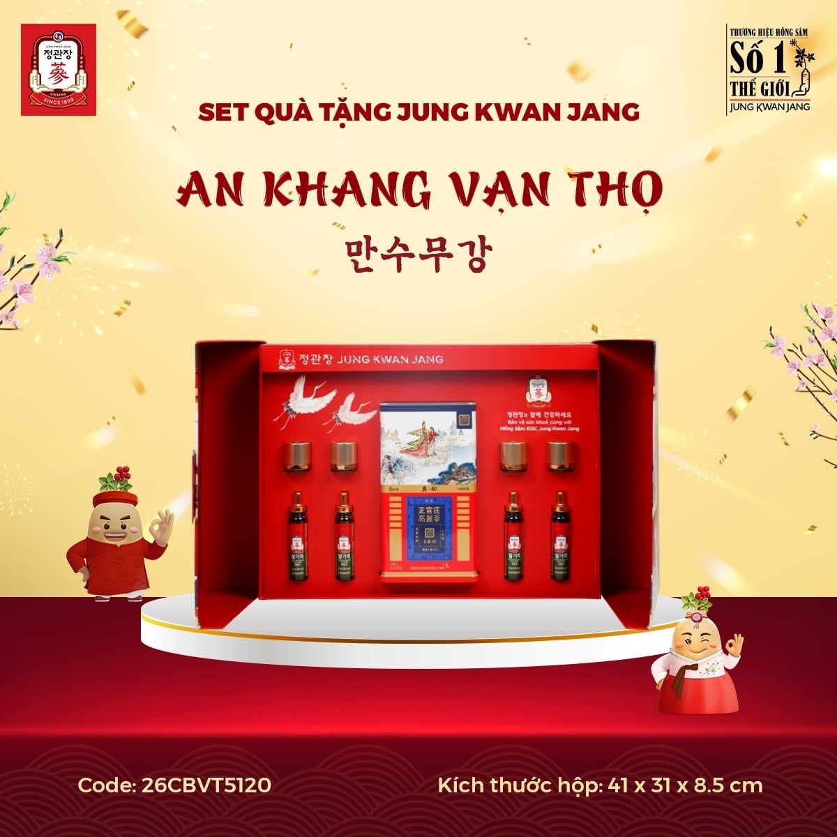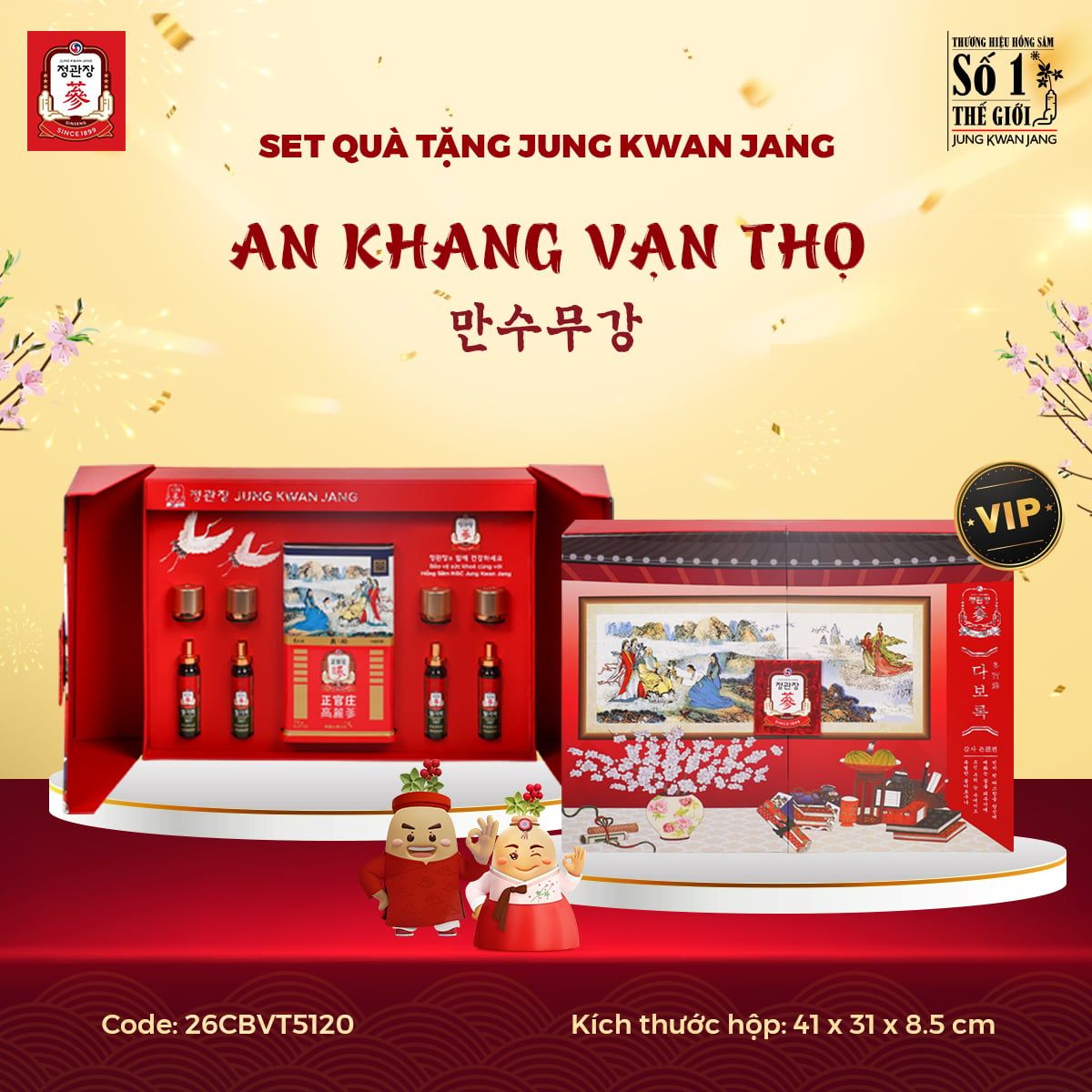 Nằm trong BST phiên bản giới hạn Limited Edition của Set Quà Tặng Jung Kwan Jang 2025, AN KHANG VẠN THỌ mang ý nghĩa cầu mong một năm mới an khang với sức khỏe trường thọ, tất cả những lời hay ý đẹp đã được gói gọn vào trong hộp quà này. Lần đầu tiên có sự góp mặt của Lương Sâm Nguyên Củ thượng hạng trong một set quà, kết hợp cùng bộ đôi Viên Hồng Sâm Vital Pill và Nước Hồng Sâm Vital Tonic, đây là món quà tặng vô cùng quý giá và ý nghĩa dành cho những mối quan hệ thân quý.