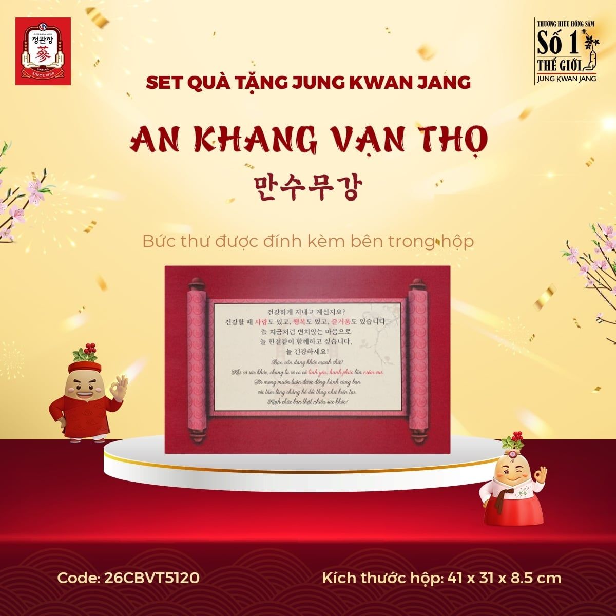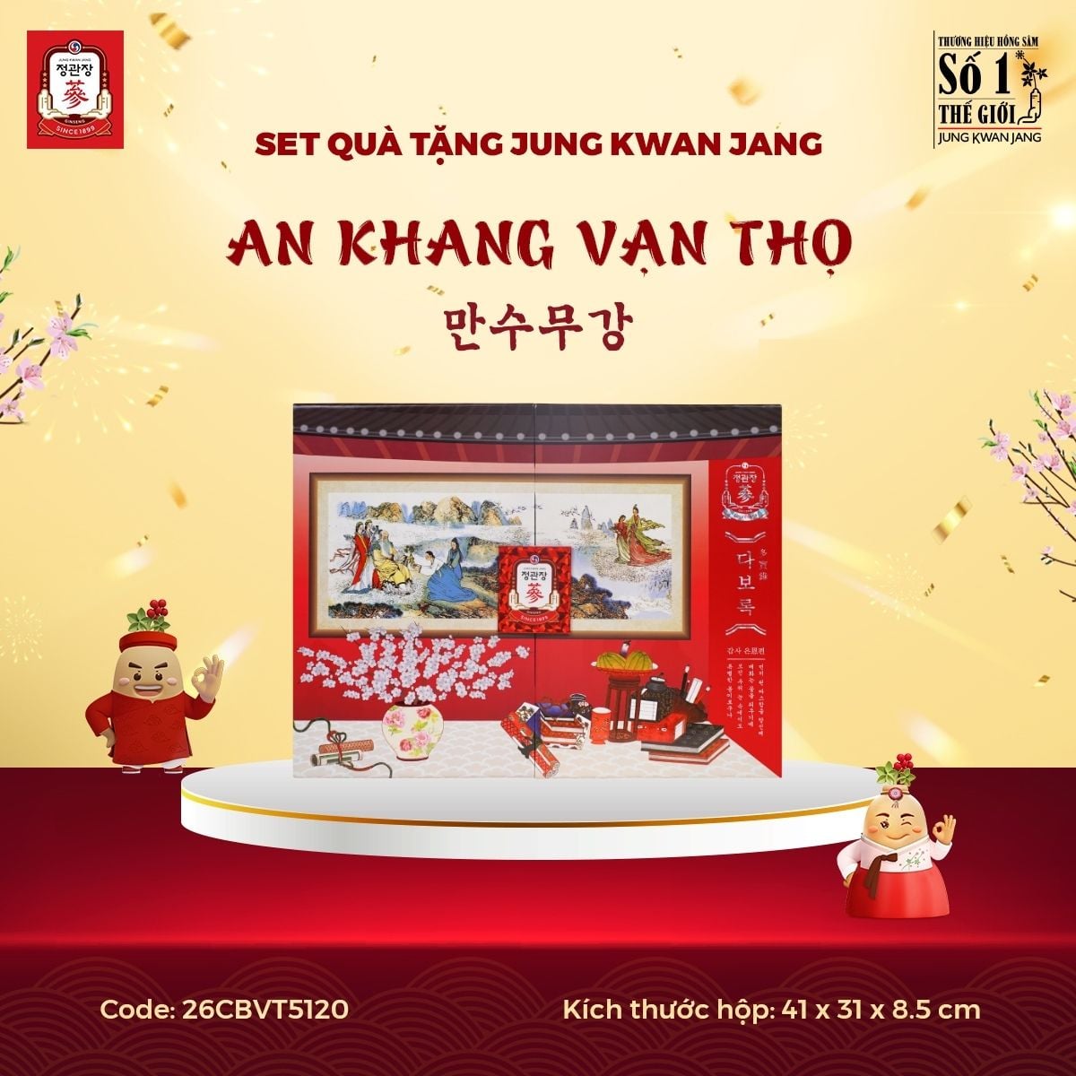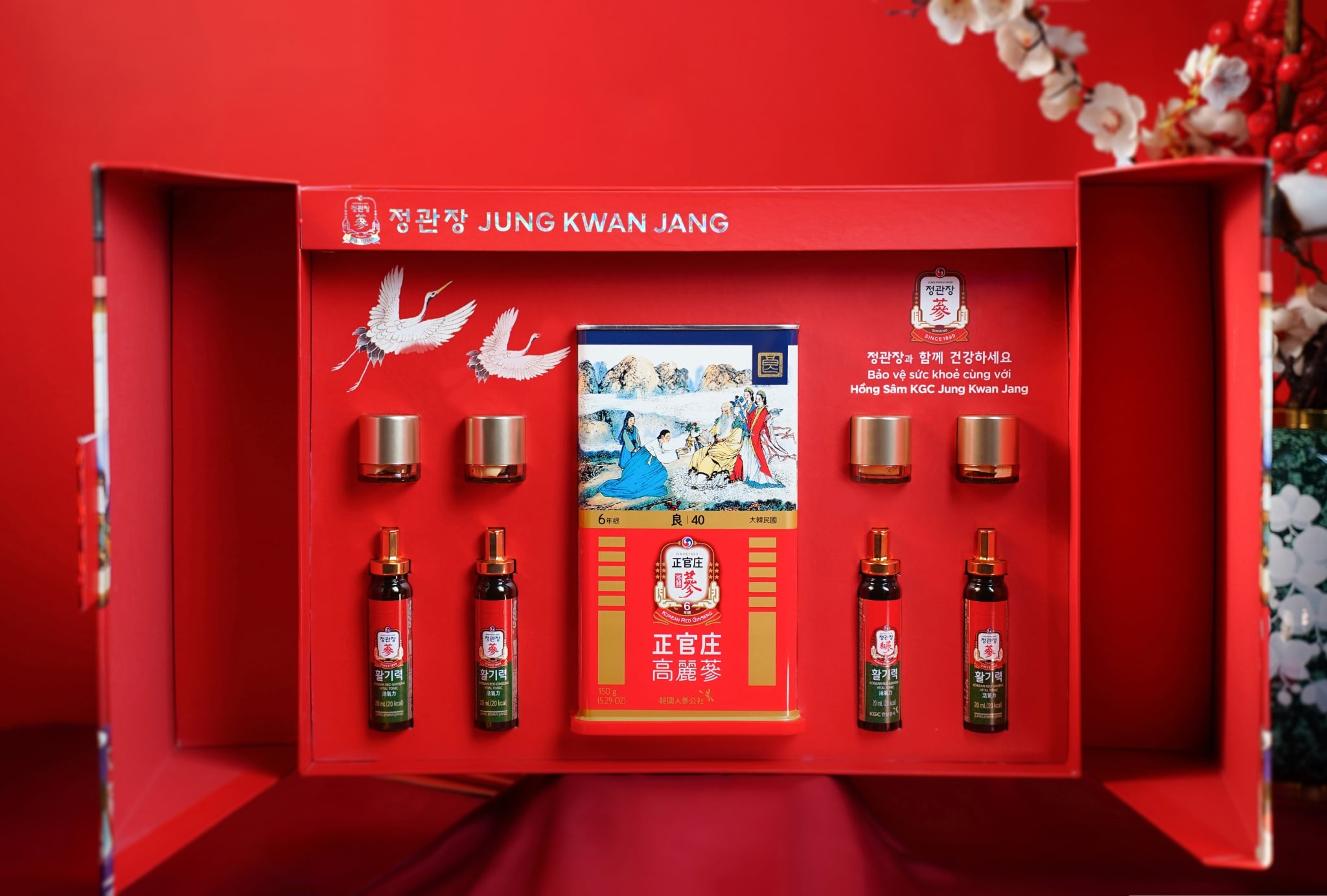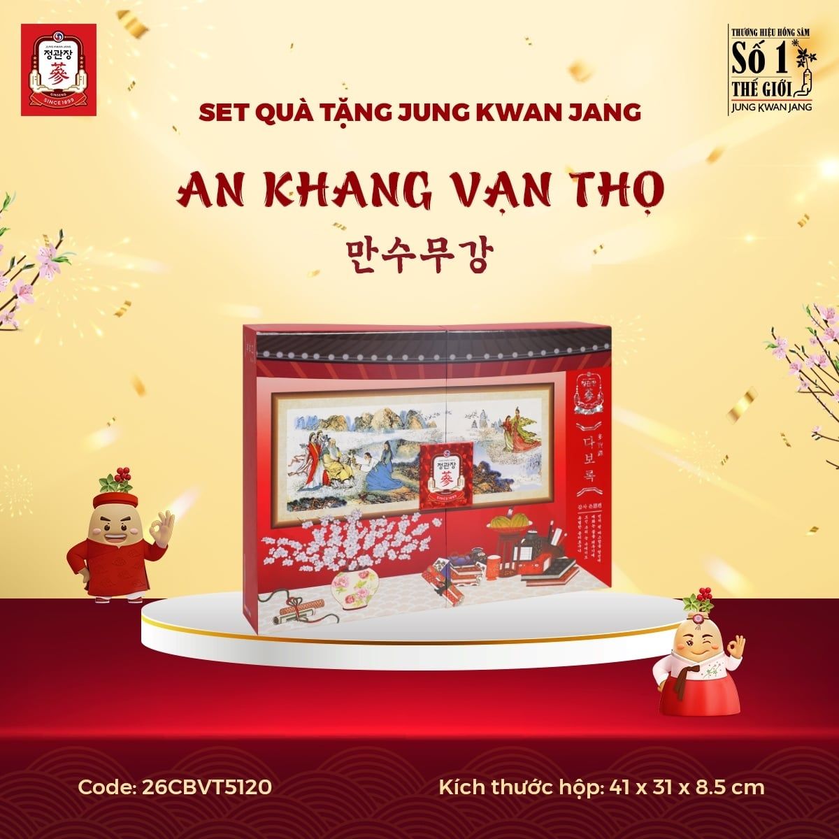 Nằm trong BST phiên bản giới hạn Limited Edition của Set Quà Tặng Jung Kwan Jang 2025, AN KHANG VẠN THỌ mang ý nghĩa cầu mong một năm mới an khang với sức khỏe trường thọ, tất cả những lời hay ý đẹp đã được gói gọn vào trong hộp quà này. Lần đầu tiên có sự góp mặt của Lương Sâm Nguyên Củ thượng hạng trong một set quà, kết hợp cùng bộ đôi Viên Hồng Sâm Vital Pill và Nước Hồng Sâm Vital Tonic, đây là món quà tặng vô cùng quý giá và ý nghĩa dành cho những mối quan hệ thân quý.